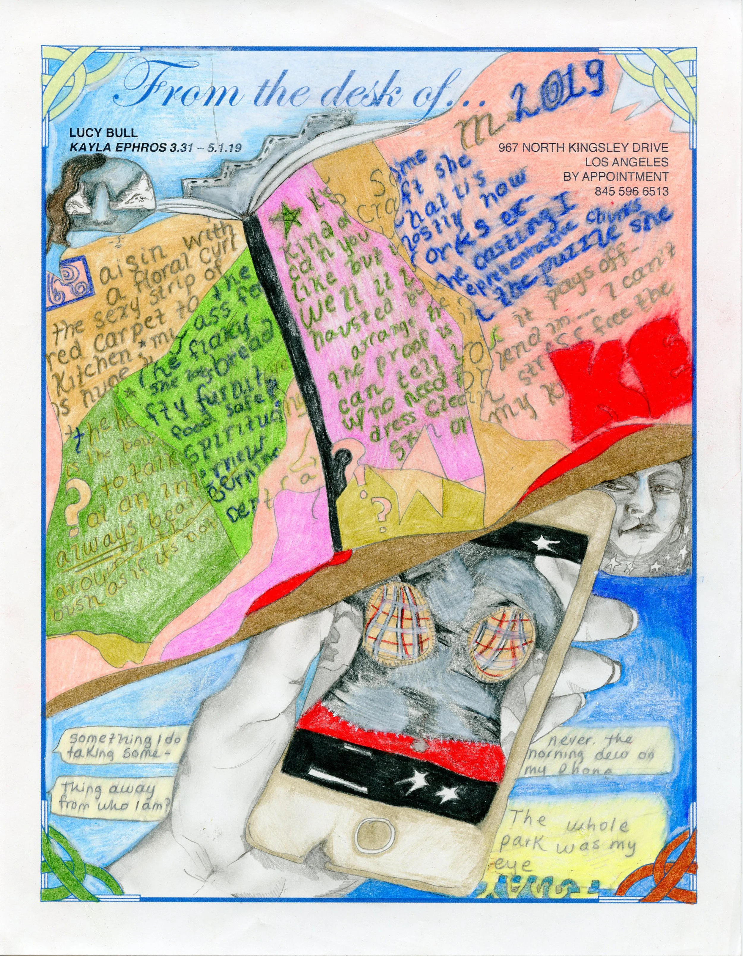 Kayla Ephros (b. 1992, New Jersey) is an artist, poet, and teacher. She received her BFA from the California Institute of the Arts in 2016. Her recent solo exhibitions include Mood Song at Et al. (San Francisco) and Zen Yenta at in lieu (Los Angeles). Her work has been shown in several group exhibitions. Ephros has written two chapbooks; Maple Shade and Never Go To Your Room in the Daytime, from which she has given numerous readings around the country. Ephros is currently a Fellow in the Teaching Artist program at the Armory Center for the Arts. She also is also the creator and co-organizer of the semiannual Interdisciplinary Poetry Workshop at the Kesey Farm. She currently lives and works in Los Angeles.