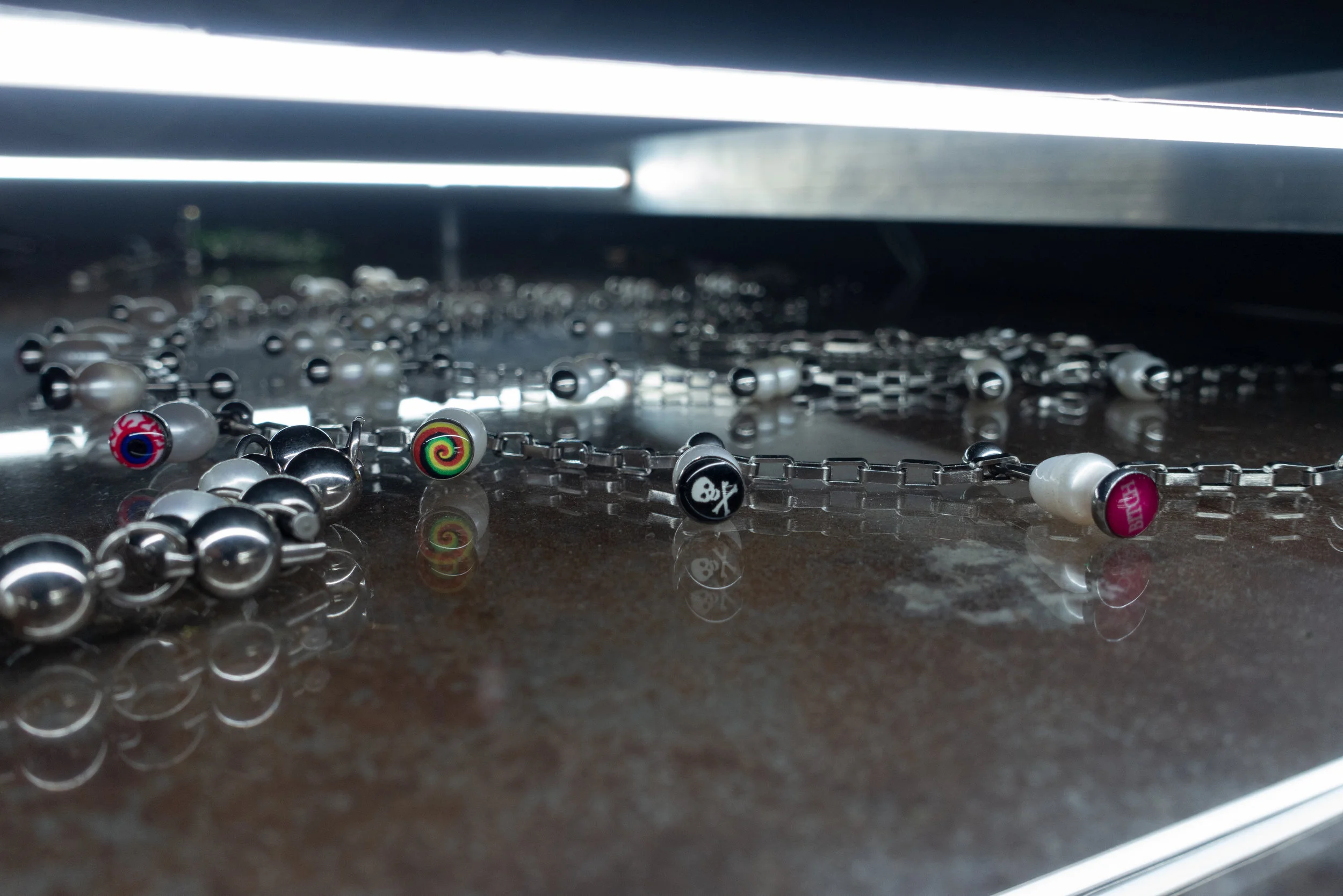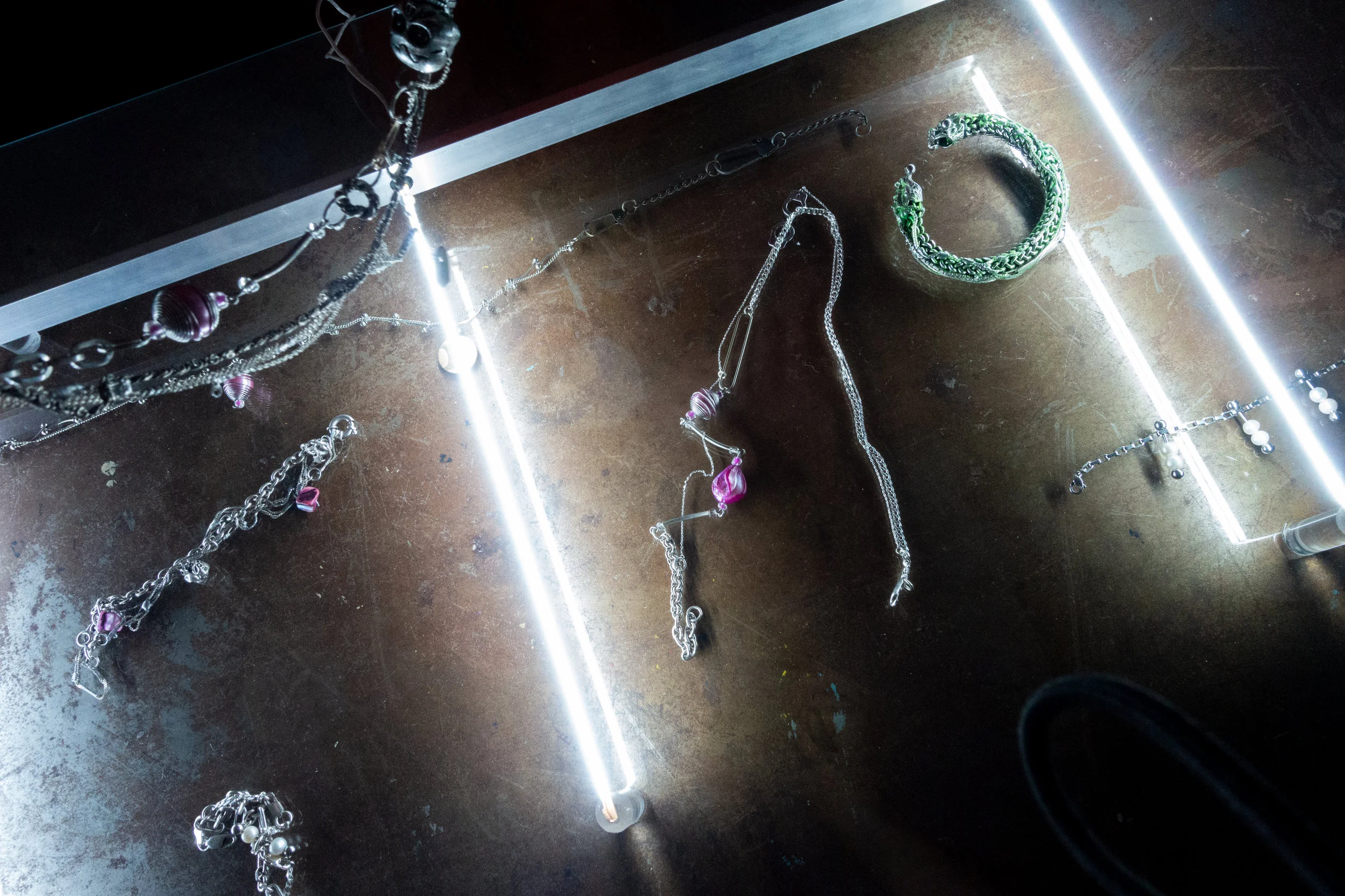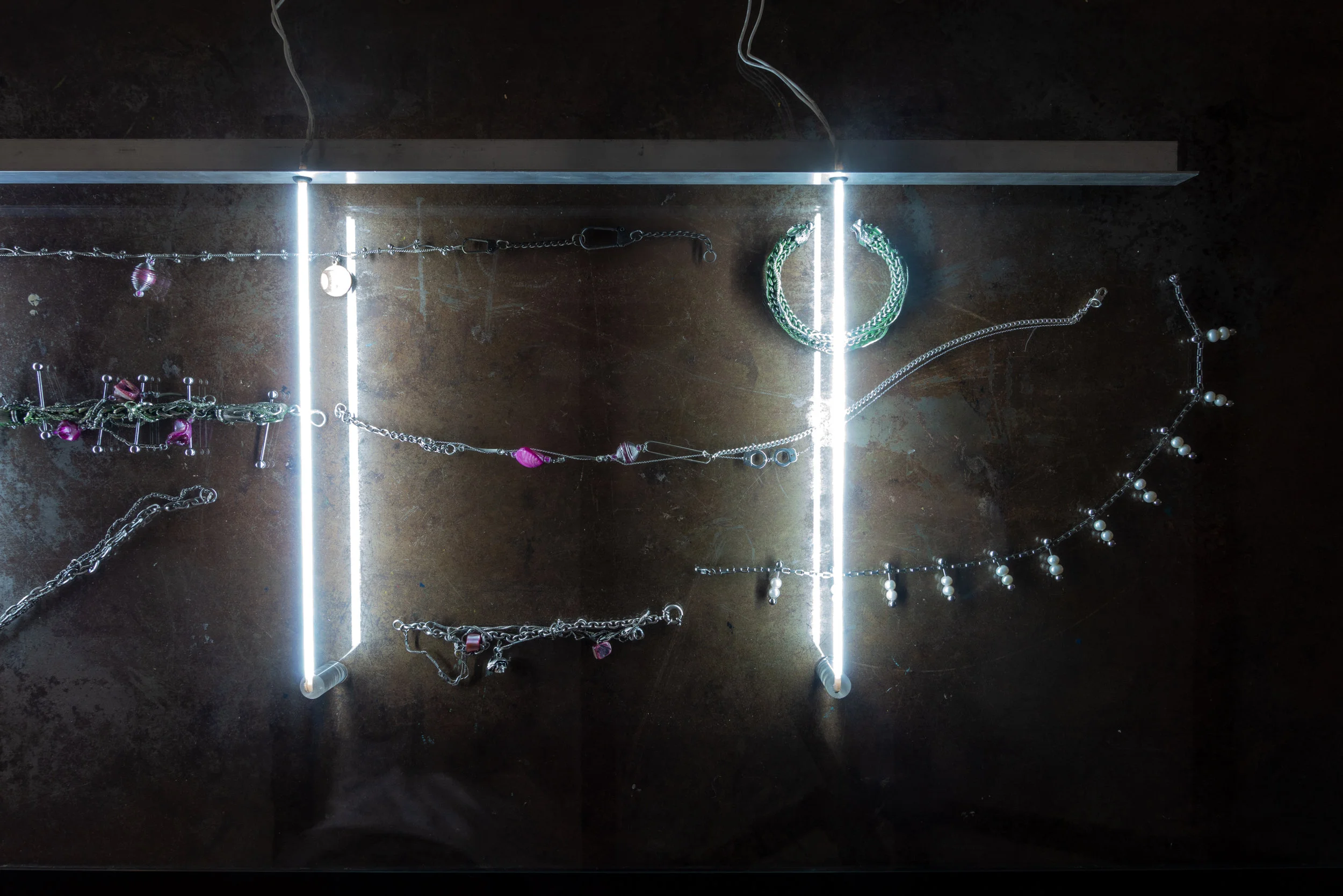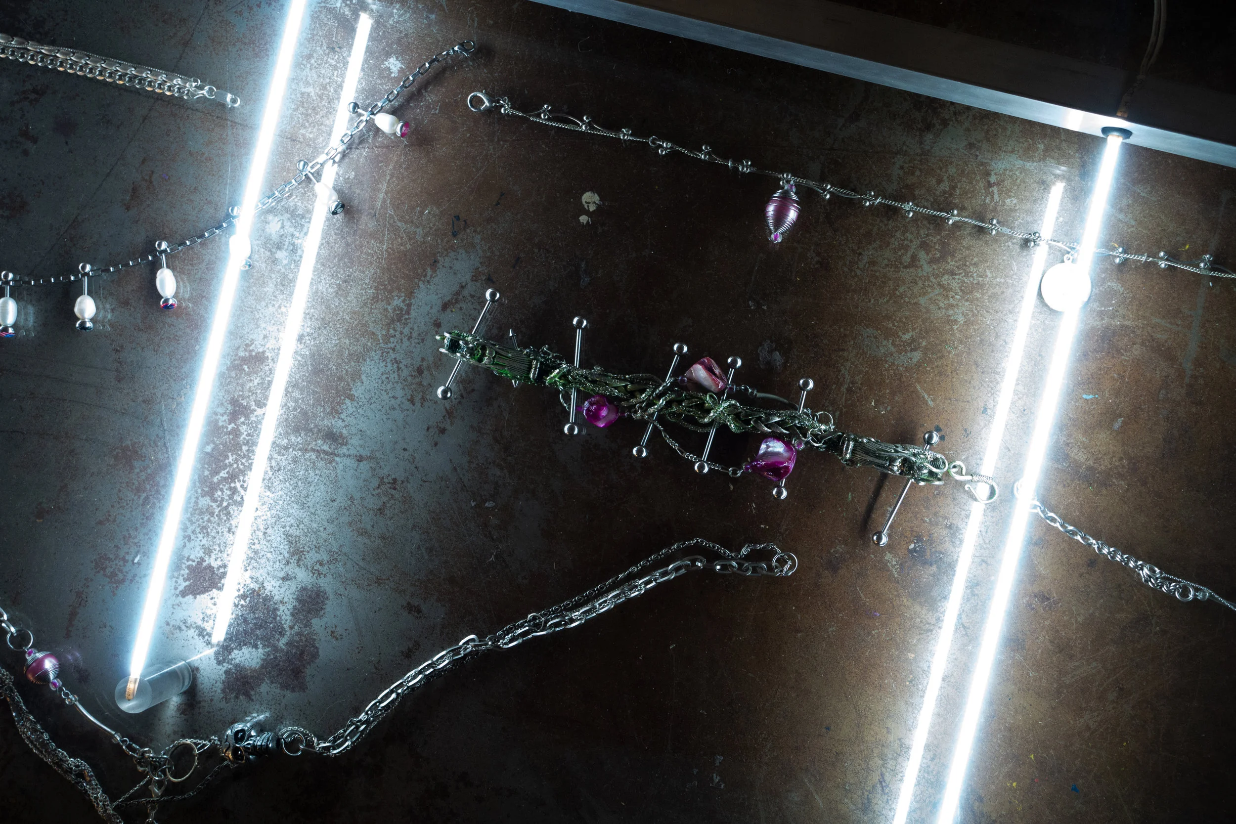 6 Untitled, sterling silver, surgical steel, enamel, swarovski and nacre gem stones, 19 x 0.25 x 0.25 in, 2019