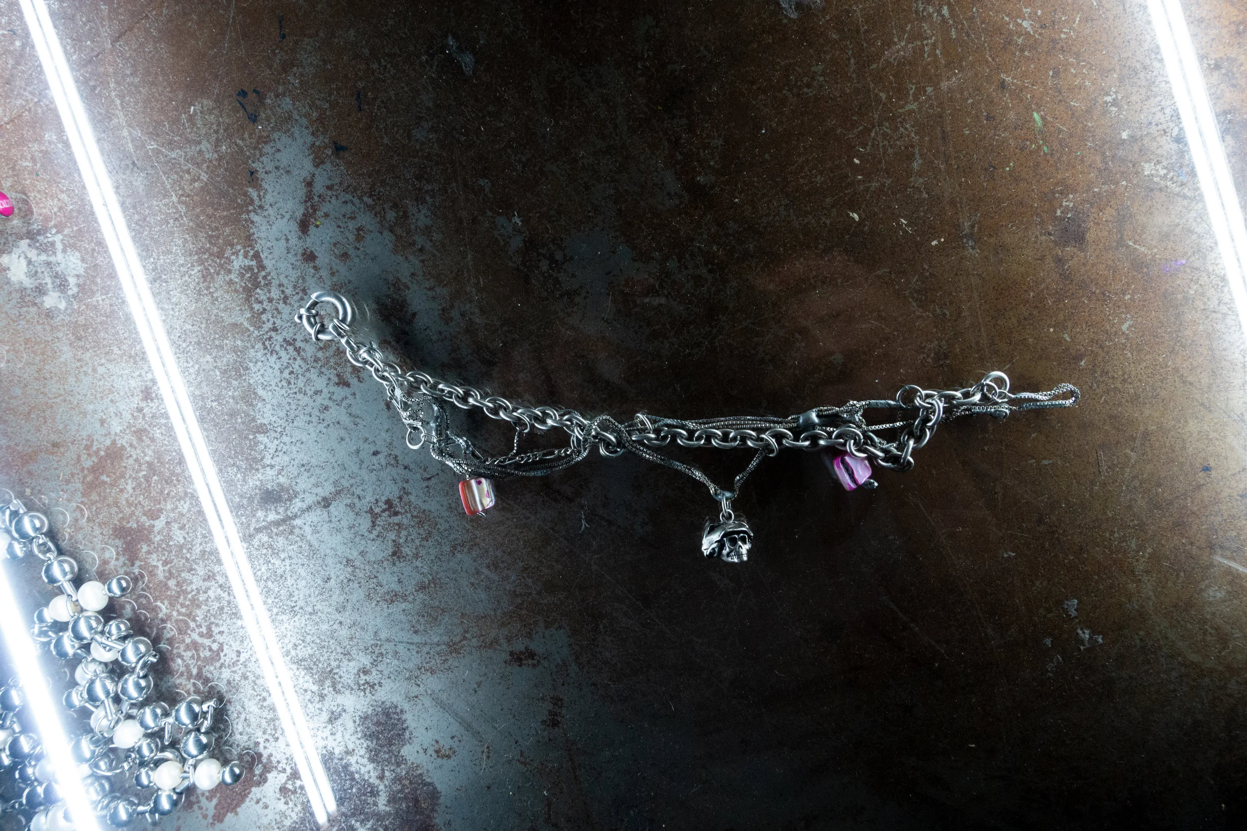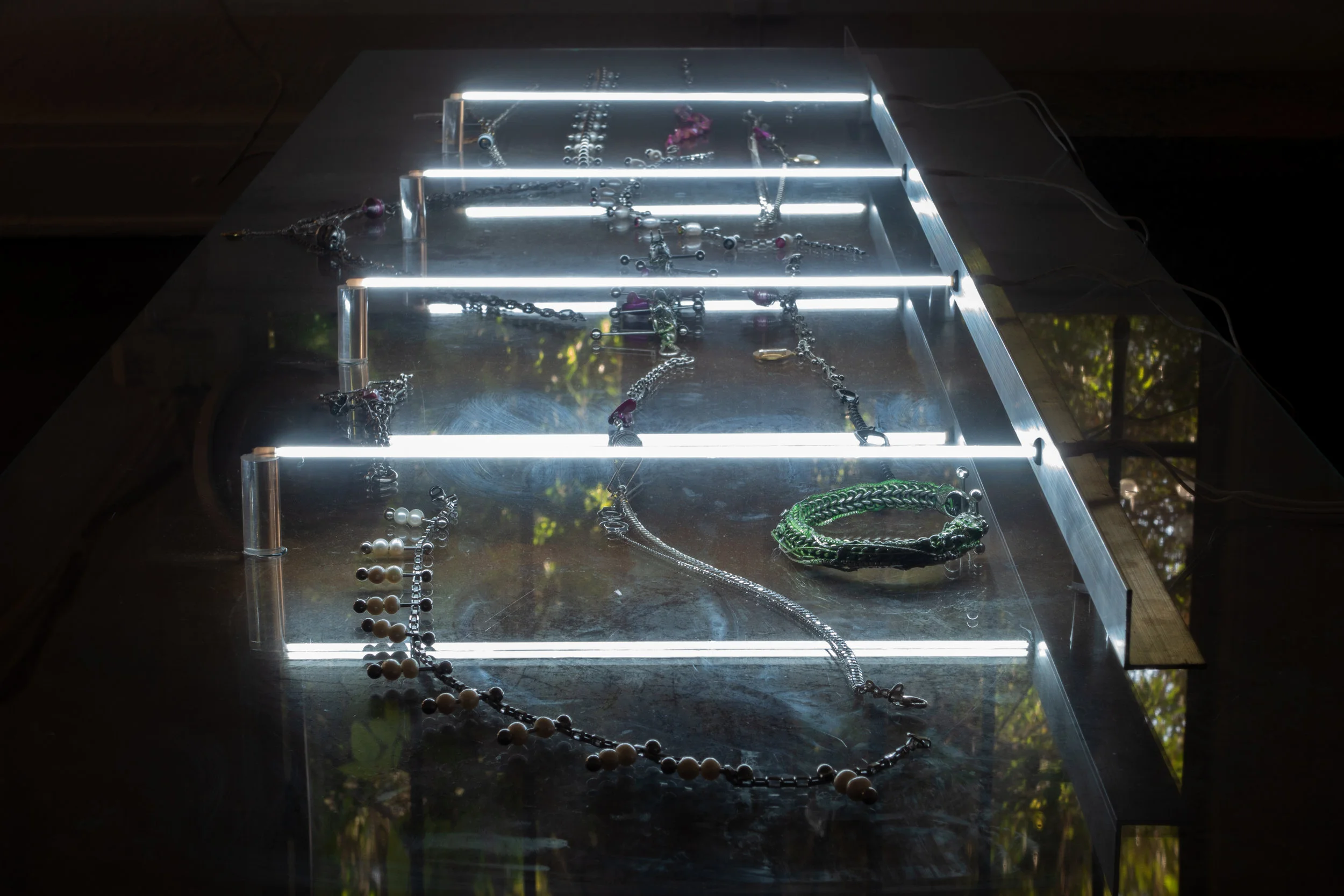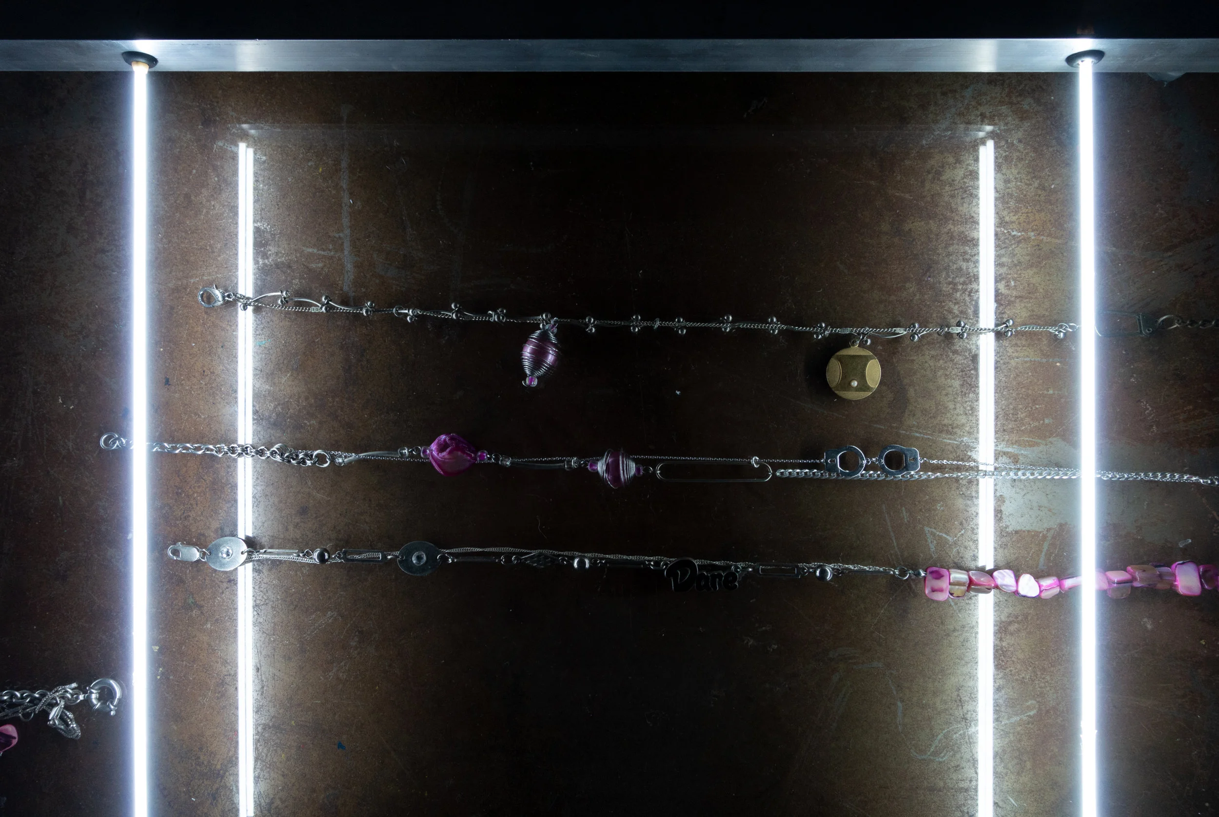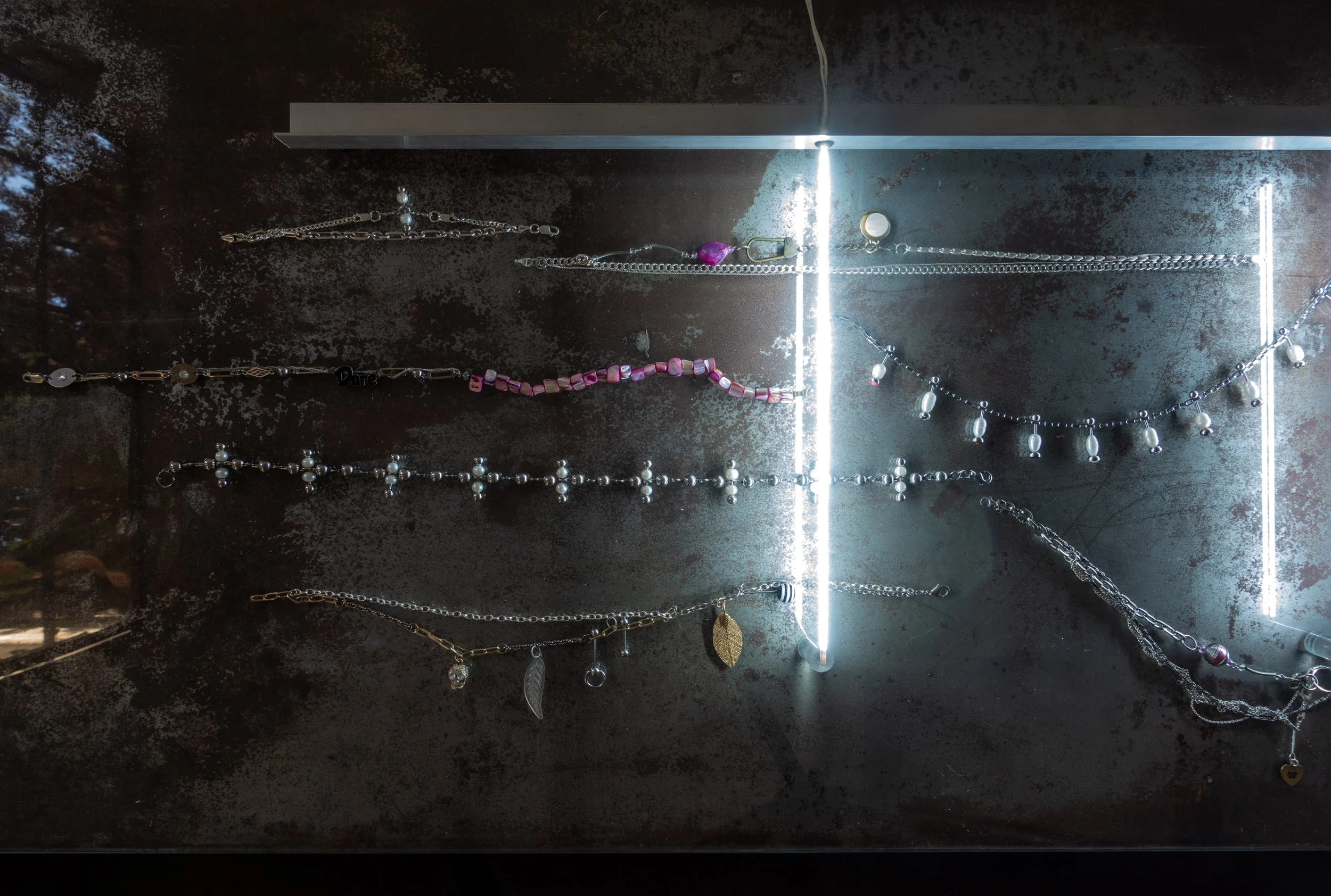 6 Untitled, sterling silver, surgical steel, enamel, swarovski and nacre gem stones, 19 x 0.25 x 0.25 in, 2019