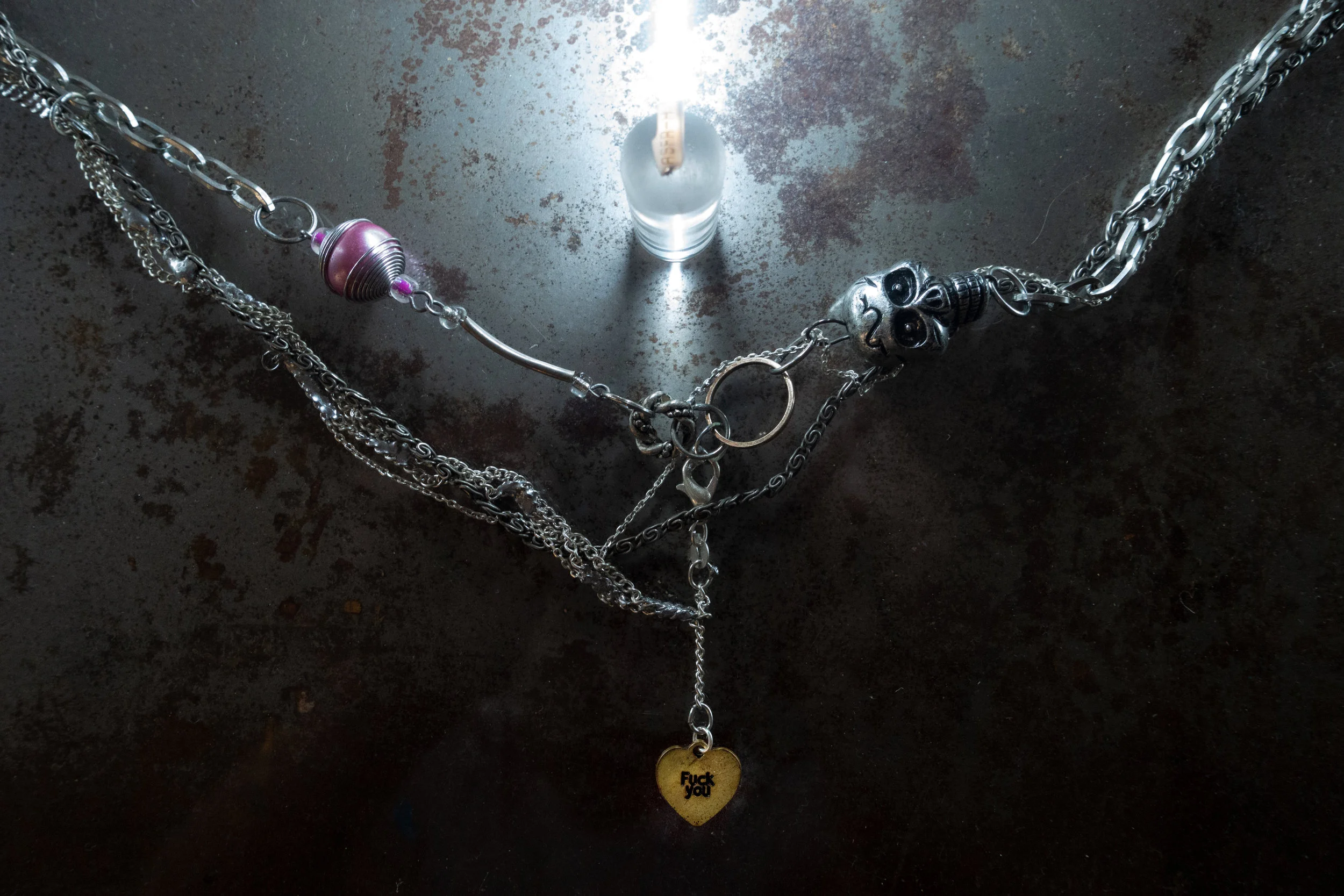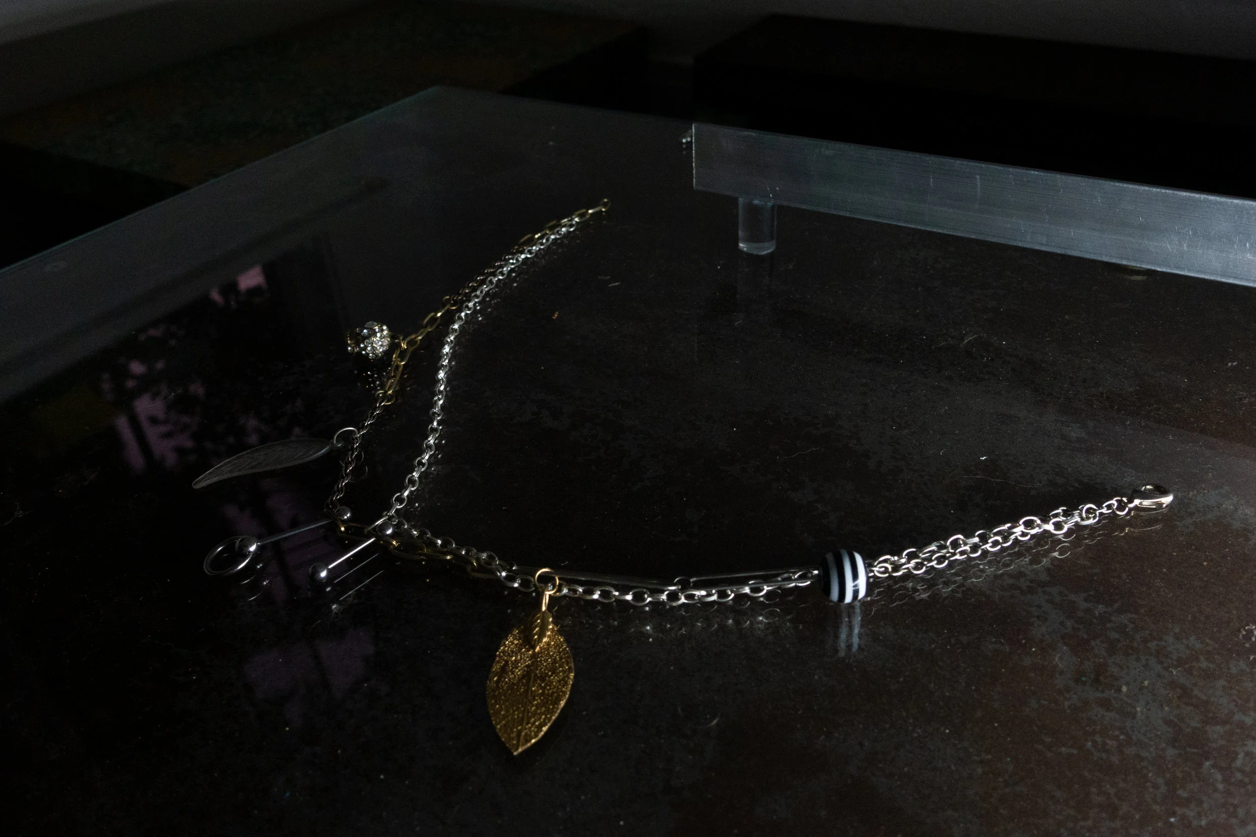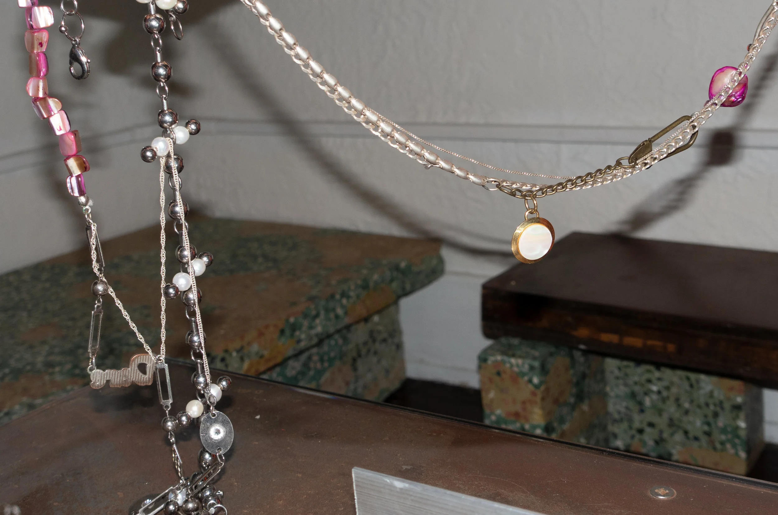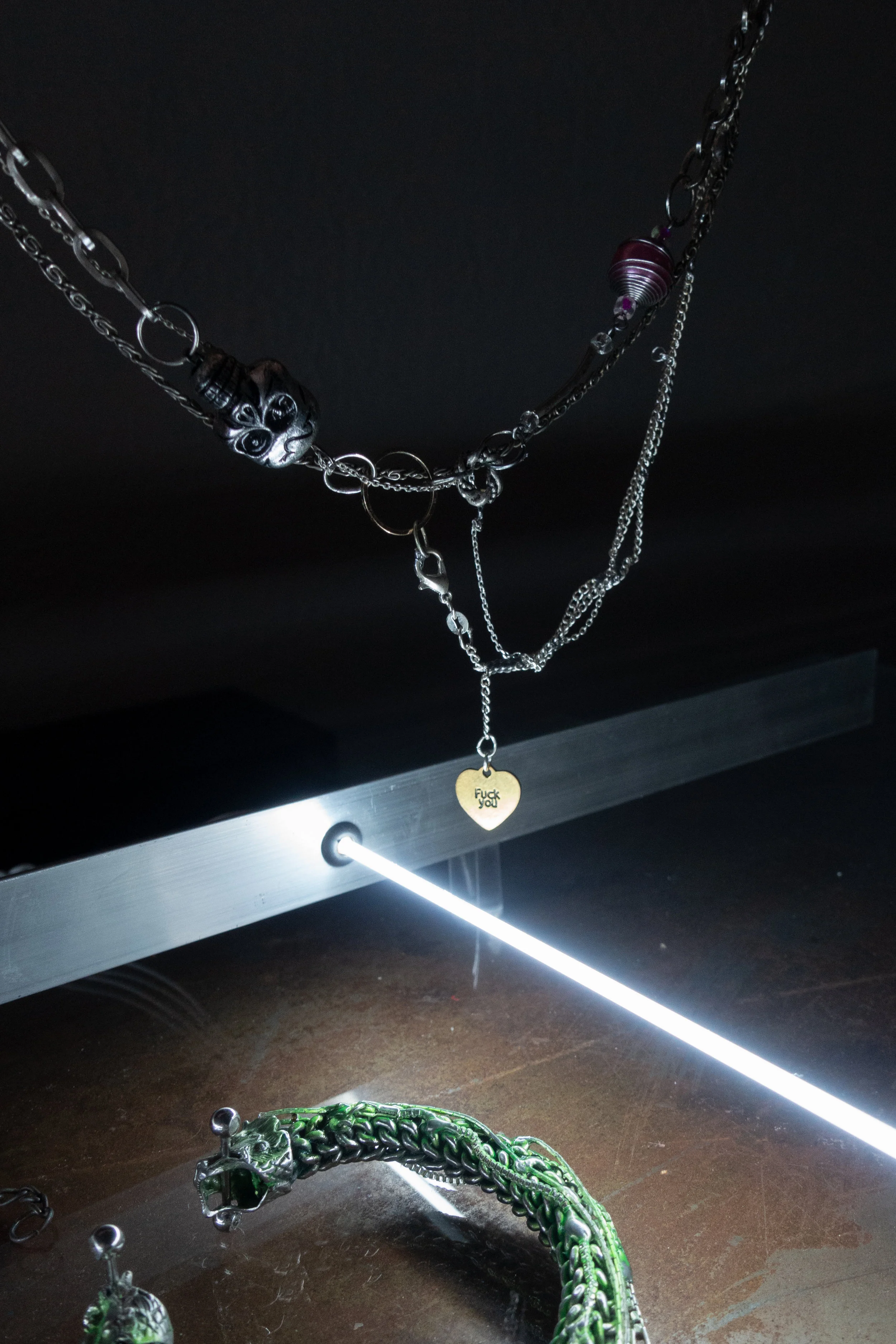 6 Untitled, sterling silver, surgical steel, enamel, swarovski and nacre gem stones, 19 x 0.25 x 0.25 in, 2019