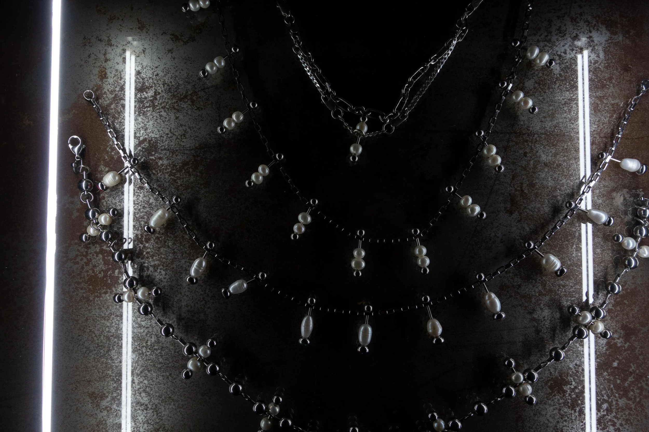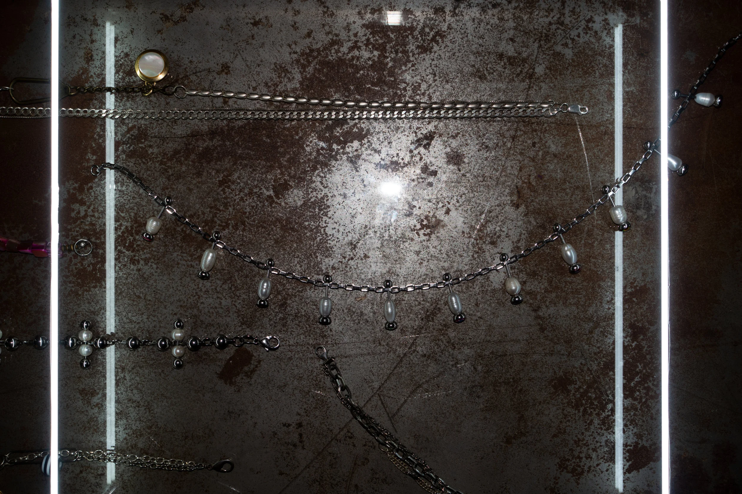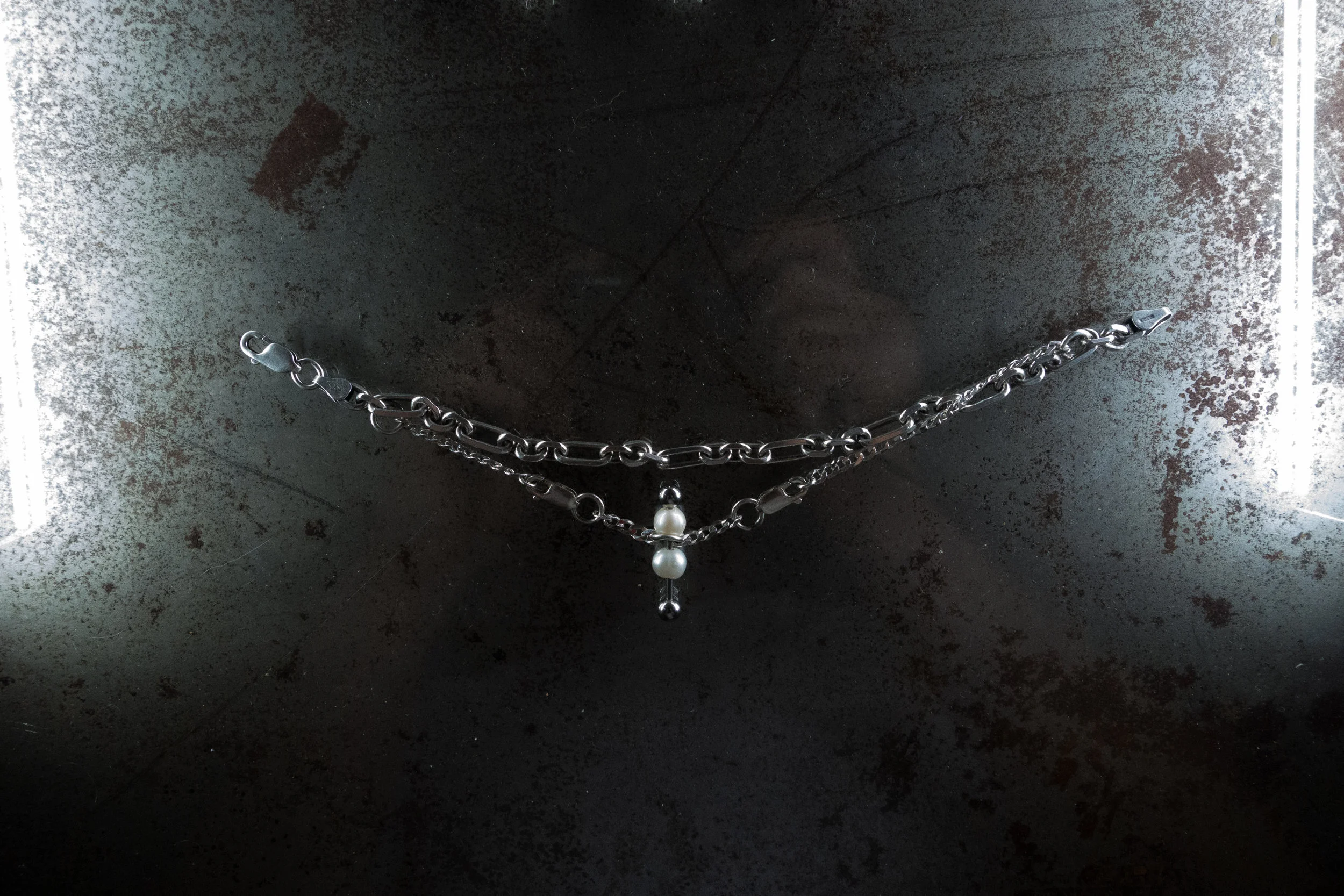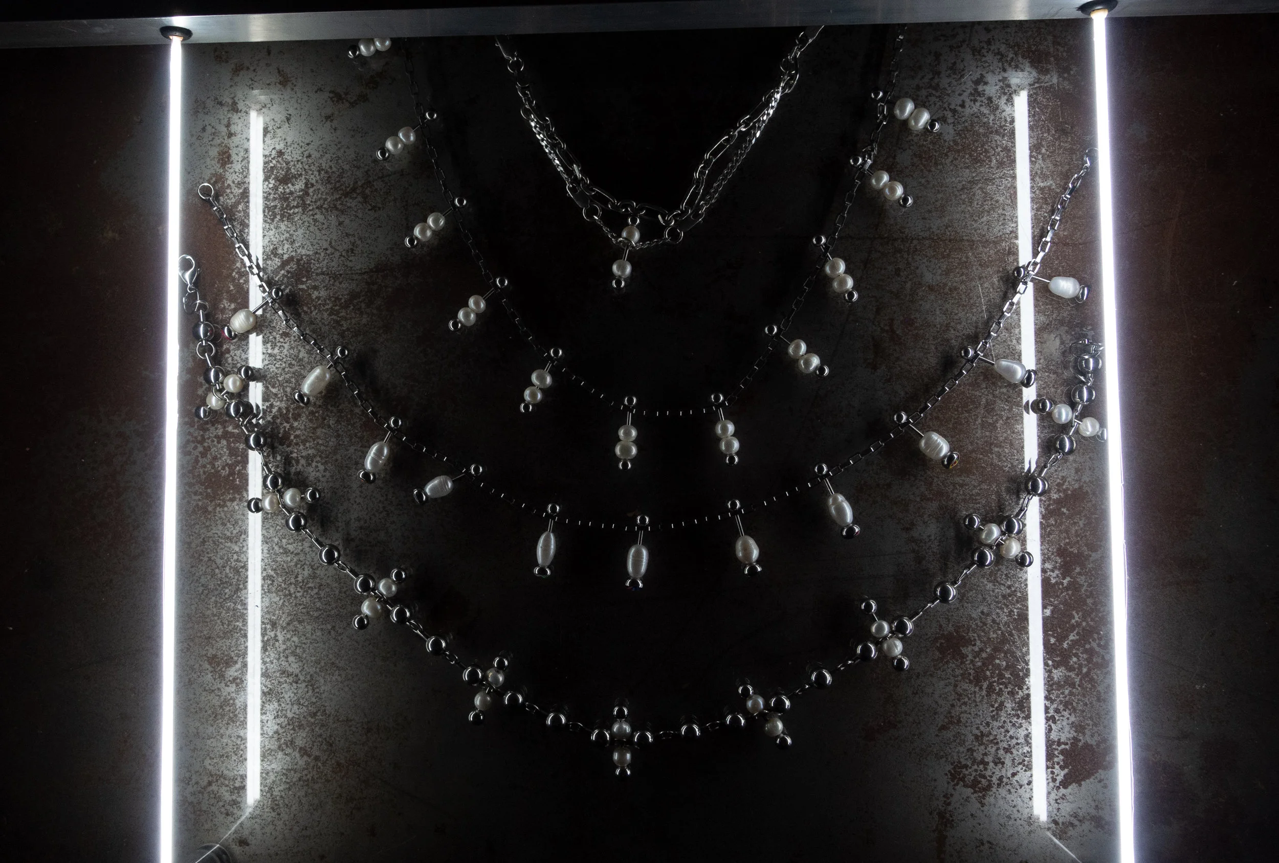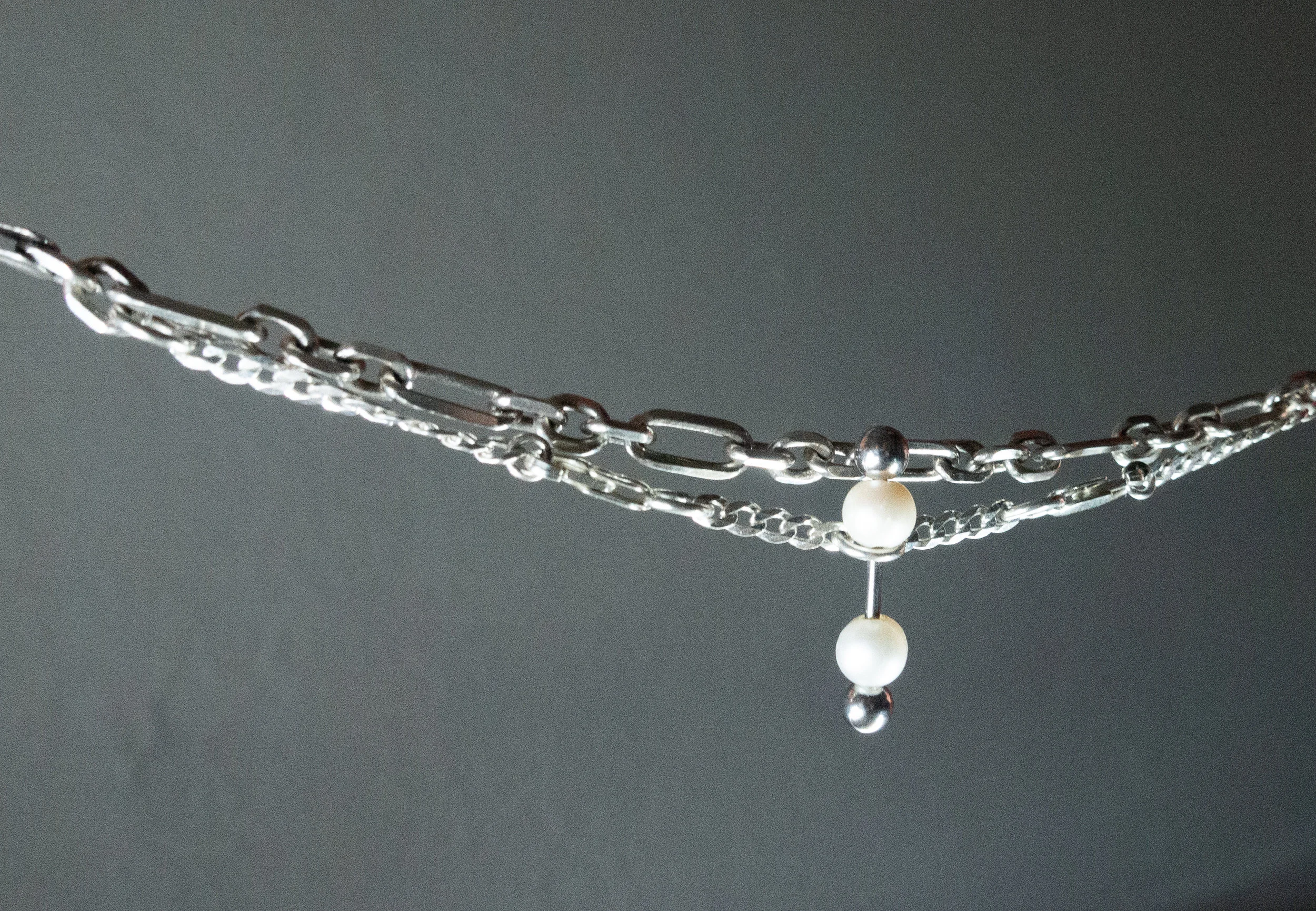 12 Untitled, sterling silver, surgical steel and pearls, 8 x 1.25 x 0.25 in, 2019